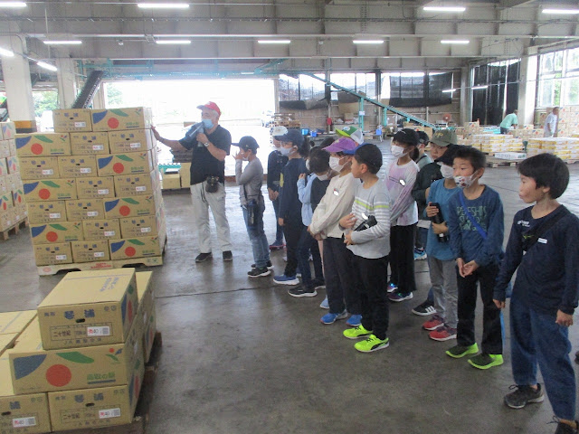今日は3年生の二十世紀梨栽培体験の締めくくりの活動日。前半は釛地区にある梨選果場の見学、後半は入江さんの梨園で収穫体験でした。天候の心配をしましたが、雨が降った前半は選果場内の見学、後半の収穫作業の時は晴れ間ものぞくくらいに回復しました。