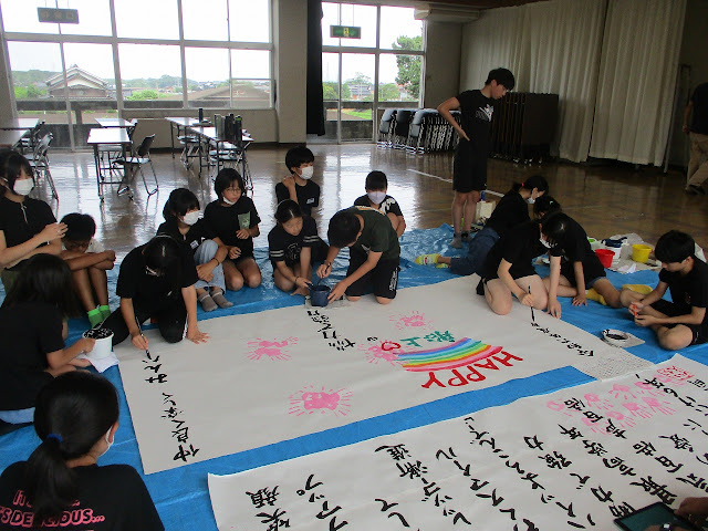 今年も6年生は、山田美鈴先生にお世話になって大型書道に取り組みました。6年生として大切にしたいこと、目指すべき姿や行動について事前に話し合い「書」で表現します。